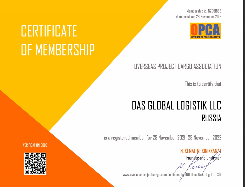- Сертификат, подтверждающий членство в OPCA по проектным грузам на 2022 гг.
